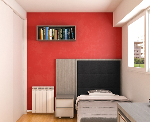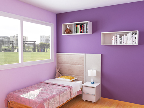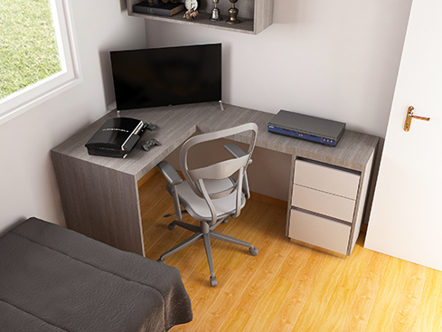 Para el dormitorio del niño se realizó un escritorio esquinero, buscando optimizar el espacio ya qué las medidas del ambiente eran reducidas. En el caso del dormitorio de la niña, se colocó un escritorio tocador.